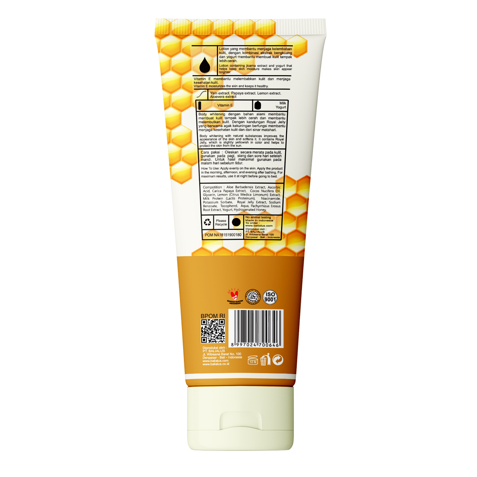 Body Whitening dengan bahan alami membantu membuat kulit tampak lebih cerah dan melembutkan kulit. Dengan kandungan Royal Jelly yang berwarna agak kekuningan berfungsi membantu menjaga kesehatan kulit dari sinar matahari.